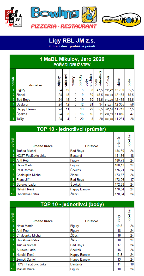 1. MaBL Mikulov – Jaro 2026 Ligový pohár Mikulov 2026 BDL 2025 1. MaBL Mikulov –Jaro 2026 2. MaBL Mikulov – Jaro 2026 3. MaBL Mikulov – Jaro 2026 DOHRÁNO Výsledkové listy ke stažení 1. kolo 2. kolo 3. kolo 4. kolo Ligový žebříček RBL JM