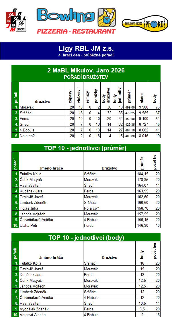 2. MaBL Mikulov – Jaro 2026 Ligový pohár Mikulov 2026 BDL 2025 1. MaBL Mikulov –Jaro 2026 2. MaBL Mikulov – Jaro 2026 3. MaBL Mikulov – Jaro 2026 DOHRÁNO Výsledkové listy 1. kolo 2. kolo 3. kolo 4. kolo Ligový žebříček RBL JM