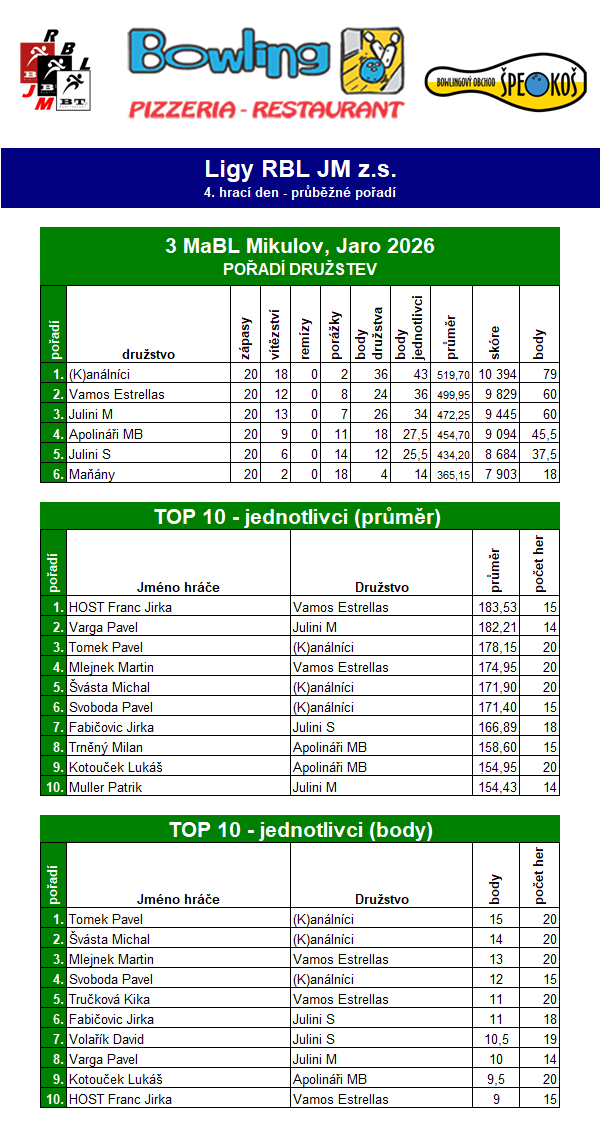 3. MaBL Mikulov – Jaro 2026 Ligový pohár Mikulov 2026 BDL 2025 1. MaBL Mikulov –Jaro 2026 2. MaBL Mikulov – Jaro 2026 3. MaBL Mikulov – Jaro 2026 DOHRÁNO Výsledkové listy 1. kolo 2. kolo 3. kolo 4. kolo Ligový žebříček RBL JM
